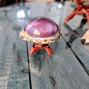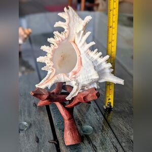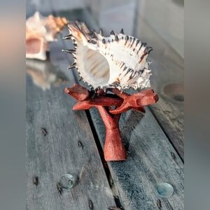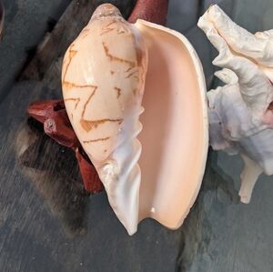 Beautiful collection of decorative seashells. Perfect variety for a collector or ocean lover. Nature's Art. Features natural tones and intricate designs. Two Murex (Zebra & Ramose), Polished Tiger Cowrie (purple top), Noble Volute, and Fox Conch. Two wooden tripod stands included, 6" & 2". Note: these are real sea shells and have natural weathering; for example the horse conch spiral end has chipped.