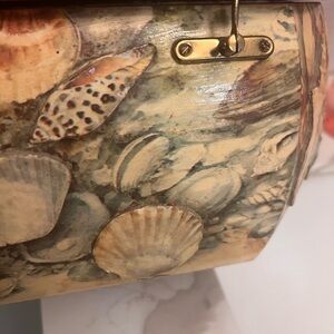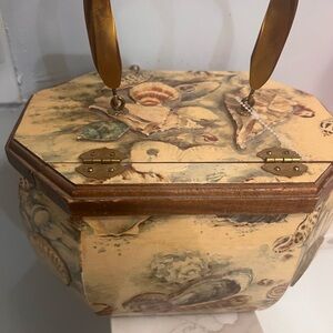 Anton Pieck wooden decoupage octagonal box purse with a shell motif. These unique, hard-shell purses were popular handmade accessories in the 1960s and