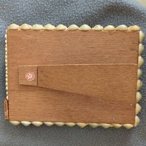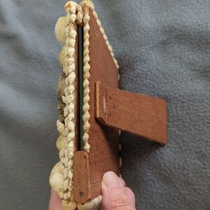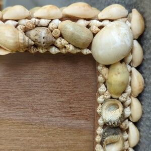 Vintage seashell picture frame. Glass and wood frame. Seashells of varying sizes circling the frame. Measures approximately 6" X 7 1/2".
