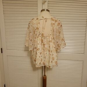 boho blouse, seashell print top, gold etch detail, sheer peasant blouse, Loft XL blouse, summer beach style, coastal grandmother, relaxed fit top, tie back blouse, vacation wear, women's bohemian fashion, see-through blouse, festival fashion, elegant casual top, feminine beachwear