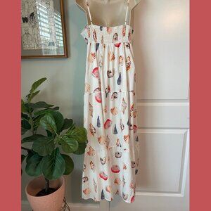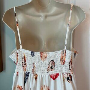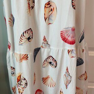 Seashell print spaghetti strap dress with white background, tiered hem, and pockets. Gorgeous designer-inspired print and design, worn once.