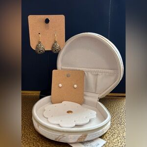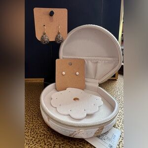 Elegant jewelry set featuring ornate earrings and a compact case. Perfect for any occasion.