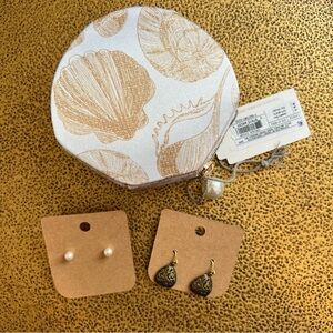 Seashell Travel Jewelry Organizer with Pearl Charm + 2 Pairs Earrings