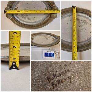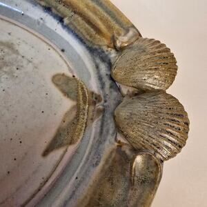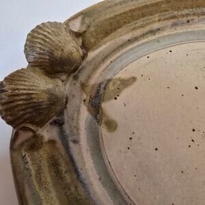 Hand made oval shaped plate with seashell shaped handles. Rustic coastal beach cottage outer banks island vibes: Hand painted in shades of gray, olive green, tan, brown. Top is glazed in a semi matte finish. Use as a functional piece in your kitchen or decorative piece anywhere. No chips or cracks. Very good preowned condition. Signed on bottom: Holloman Pottery