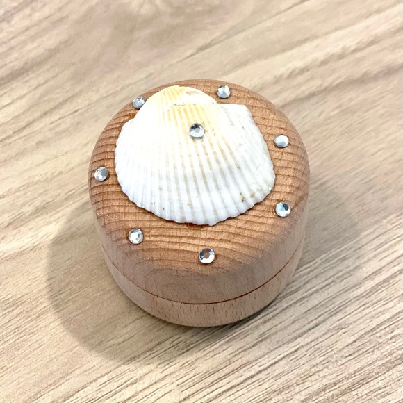 This is a handmade wooden trinket box with a seashell and crystals! It is 2 inches in diameter and slightly smaller on the inside. Trinket boxes can be used for earrings, rings, beads, buttons or anything tiny!!
