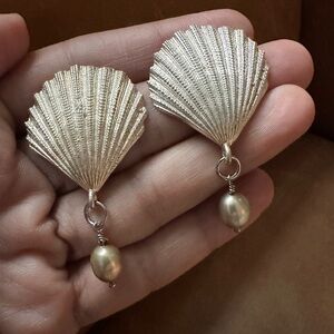 Silver brass seashell earrings adorned w grey freshwater pearls