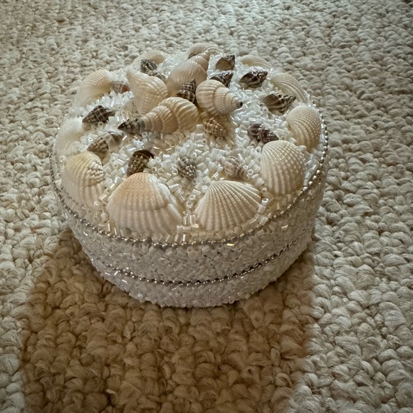Beautiful round box adorned with seashells. Perfect for jewelry or hair accessories. 4” in width, 1 5/8” length. Excellent condition.