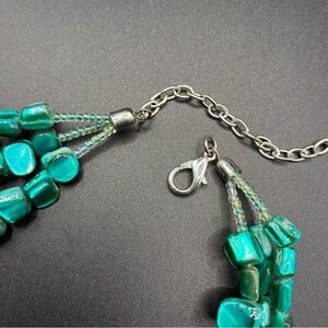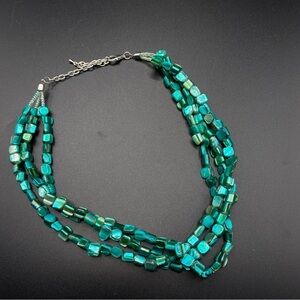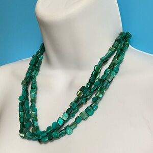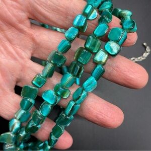 Seashells Dyed Turquoise Natural Beads Mulitstrand Necklace. Measures approx 17"+ 4" extender chain. Bright natural shell pieces have been dyed briiliant aqua/turquoise colors. Three stranded necklace is in very good condition, appears only gently worn, if at all. #8