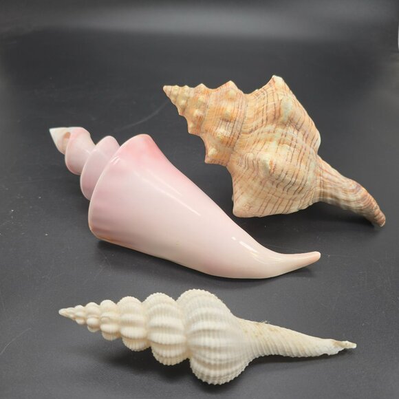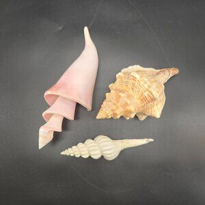 This set of three conch spiral seashells exhibits natural pink and beige tones, ideal for display purposes or crafting projects, adding elegance and beach-inspired charm.