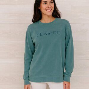 Cozy and casual, this Seaside crewneck sweatshirt is perfect for layering or lounging. Designed in a blue-green coastal wash with classic lettering across the chest, this pullover offers a relaxed fit and timeless style for everyday wear.