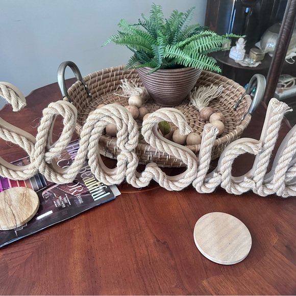 Decorative rope sign spelling 'Seaside'. Perfect for coastal-themed decor. 27” wide by 8” high