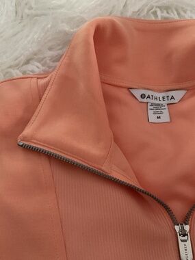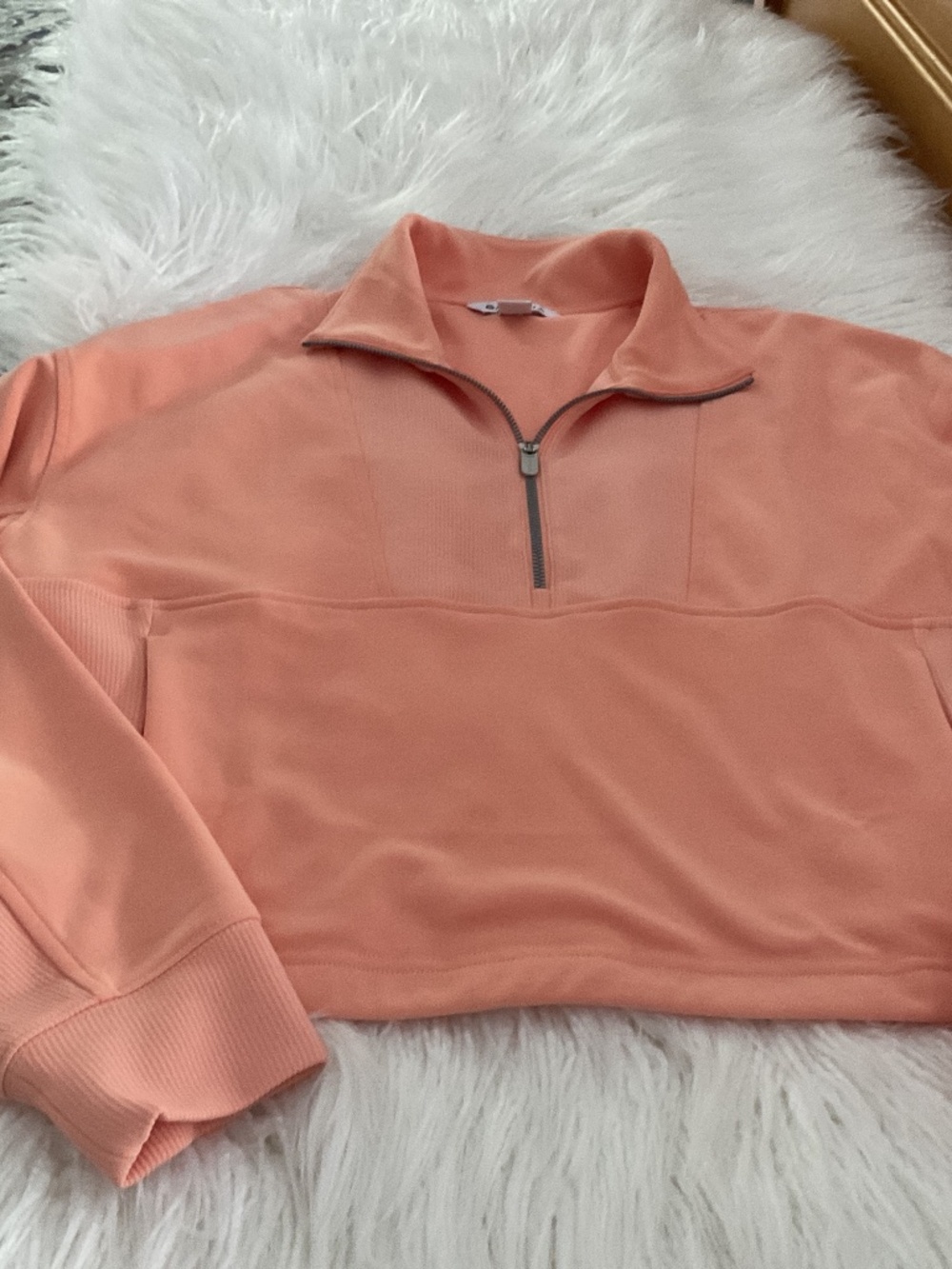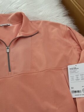 Athleta Seasoft Rib 1/4 Zip Popover in Papaya. Has a large front pocket and adjustable drawstring at the bottom of the sweatshirt. Size medium. NWT. Originally $ 119.00