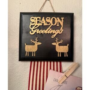 Season Greetings Card Holder Black Gold Script Topper Red Striped Wide Ribbon
