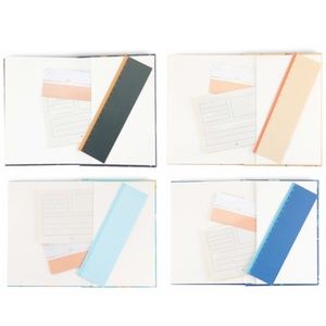 -Hardcover with elastic closure and bookmark ribbon. An expandable inner pocket contains a label sticker