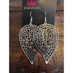 Four dainty yellow rhinestones haphazardly adorn the front a leafy silver frame filled with airy geometric detail, creating a sparkly seasonal display. Earring attaches to a standard fishhook fitting.