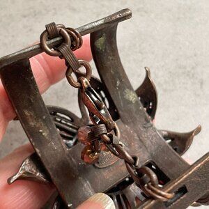 This is a hard form metal cuff bracelet with chain and lobster claw closure. The centerpiece is an applied cast metal flower covered in blue, cream and orange crystals. It could be bronze, brass or plated metal--nothing is specified. Marking on back.