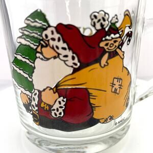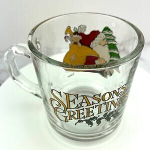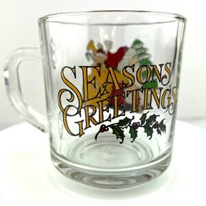 This clear glass Coffee Cup by Anchor Hocking features Santa with his bag on the front and the words "Seasons Greetings" on the back.