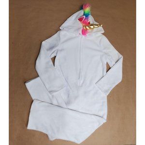 The perfect costume for your Unicorn fan. This costume includes one jumpsuit featuring a faux fur rainbow color tail and mane, ears, and a golden horn.