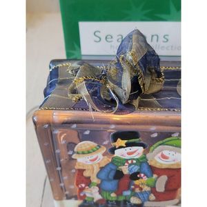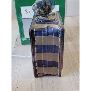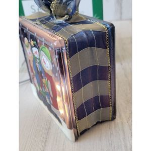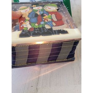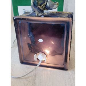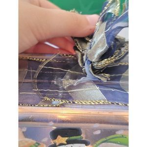 Product bow on top has some tearing and is lifting with some glue residue visible, mild scratches and marks but otherwise in good condition. Product lights up on inside