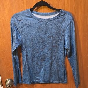 Trendy shirt with a blue speckled collar. Black body for a sleek look. Made in the USA.