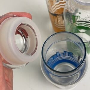 Glass Bootles featuring a Seattle scene: Space Needle, Mountains, Ferry. Each has a sealing lid. Yellow, Green, & Blue. OXO CALC, OXO Canvas, OXO Shared. Unique water bottles or storage containers.