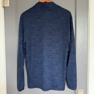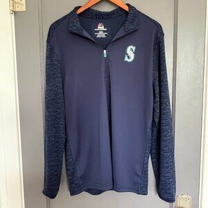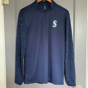 Majestic Cool Base Seattle Mariners Baseball quarter-zip long-sleeve pullover in men's size Medium (M). This top is made of a relatively lightweight athletic material. It is navy blue with a heathered pattern on the sleeves and back. The front features the Seattle Mariners "S" logo on the chest.