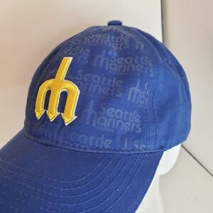 The product is a Seattle Mariners Stihl hat cap in blue, featuring the team's logo on the front. This adjustable cotton cap is suitable for fans of Major League Baseball, specifically for those who support the Seattle Mariners. The cap is one size, making it a versatile accessory for fans of all ages to show their team pride while also protecting themselves from the sun during baseball season.