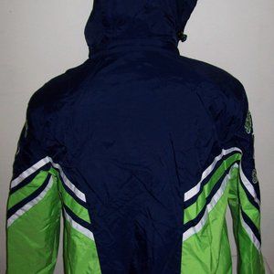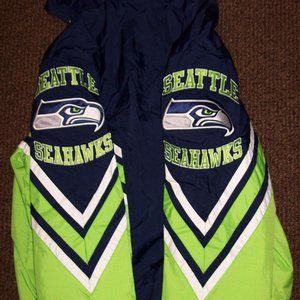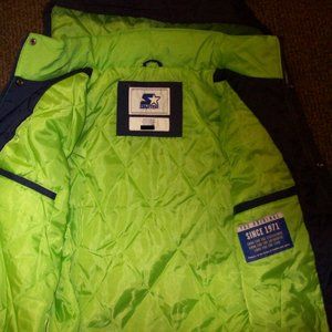 STARTER FALL 2021 NFL SEATTLE SEAHAWKS STARTER "MAXIMUM" Hooded Jacket. This is a 2021 Fall Winter Edition. NEW WITH TAGS. The Jacket is Nylon medium-weight poly-filled hooded full zip with Snap Down Overlay Jacket. The inside lining is diamond stitched. The hood detatches by zipper and has a draw string. The jacket has 2 pockets on the outside and also w inside pockets and the "SEAHAWKS" logos on the sleeves are sewn on. Measurements of the jacket side to side under arms: S: 23" M: 24" L: 25" XL: 26.5 2X: 27.5" This is a well built jacket