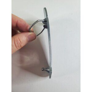 Fits a belt width up to 1.5". It's Pewter with a shiny enamel finish. Please let me know if you have any questions, see photos for measurements.