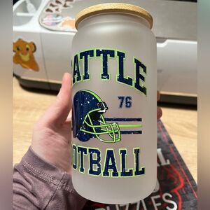Frosted glass jar with Seattle Football design. Features a blue helmet graphic and bold lettering.