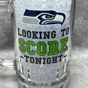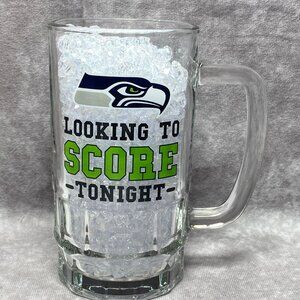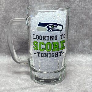 Show off your team spirit with this Seattle Seahawks glass beer mug. The mug, unbranded and made from high-quality glass, features the Hawk logo and "Looking To Score Tonight" text. It holds over 18 ounces and its clear with blue and green colors