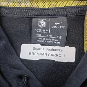 The product is a men's XXL Seattle Seahawks NFL Salute To Service Nike Onfield Military Hoodie. This officially licensed sweatshirt may or may not have belonged to coach Brennan Carroll ( son of Pete Carroll). It is designed in black with the team's logo. It is a perfect item for football fans looking to show their support for the Seattle Seahawks during the regular season games. The hoodie is a must-have for any fan of the National Football League and the Seattle Seahawks team.