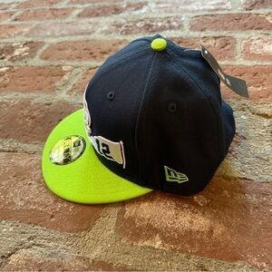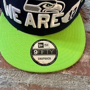 NWT Authentic and ORIGINAL 59Fifty adjustable hat by New Era, navy blue authentic poly deep crown with lime green visor and undervisor, raised embroidered team slogan WE ARE 12 and team logo on front, embroidered New Era logo on side, raised embroidered NFL shield logo on back in team colors. This Seattle Seahawks baseball cap is made by New Era and is licensed by the NFL National Football League.