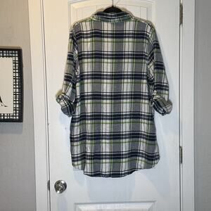 Seattle Seahawks long sleeve button up flannel with logo on the chest pocket. Blue, green and white plaid print. Cotton blend. Measurements 24” pit to pit 33” long