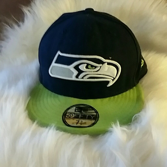 Gently used Seattle Seahawks hat silver tag on front says 59fifty measurement 7 and 3/8 green blue with silver emblem