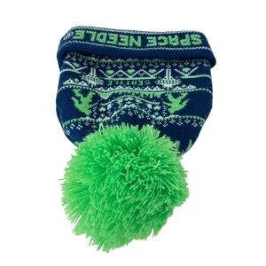 Seattle Space Needle Souvenir Beanie Hat OS Blue Green Knit Stylish Pom Pom