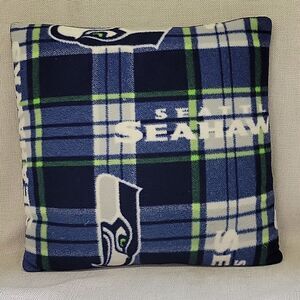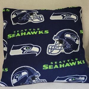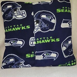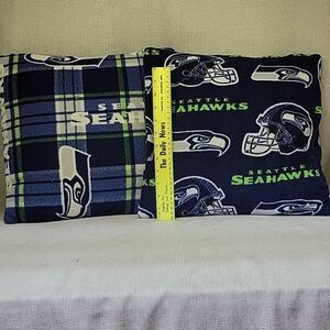 This is a pair of new in the pkg men's Seattle Seahawks slippers. A size XL 13/14. Also included is a pair of Seattle Seahawks throw pillows. Features team logo and colors. Perfect for fans.