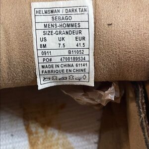 Sebago Helmsman Dark Tan Leather Boat Shoes — men’s size 8M. Crafted from premium leather with moc-toe stitching, mesh side panels, and 360° rawhide lacing. Classic slip-resistant rubber sole ideal for casual wear or boating. Note: insole pads are missing; otherwise in good preowned condition with normal creasing and light wear. Wear on the soles.