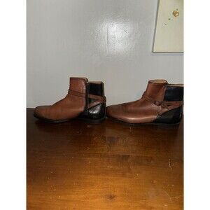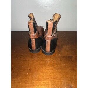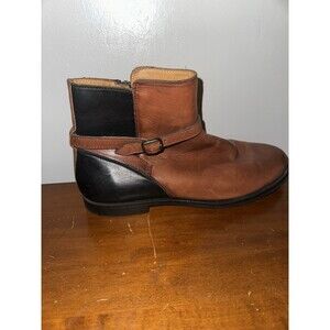The Sebago Plaza Chelsea Ankle Boots in size 10 for women are stylish and versatile leather pull-on boots with an almond toe shape. These booties feature a low block heel for added comfort and a rubber sole for durability. The brown and black color combination, along with the belt with buckle accents, gives these boots a trendy and sophisticated look suitable for various occasions such as travel, parties, casual outings, formal events, and business meetings. Made with high-quality leather and featuring elastic for a personalized fit, these boots from Sebago offer both style and practicality for the modern woman.