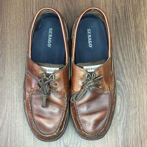 Classic Sebago boat shoes in tan leather. Perfect for casual wear. Durable and stylish.