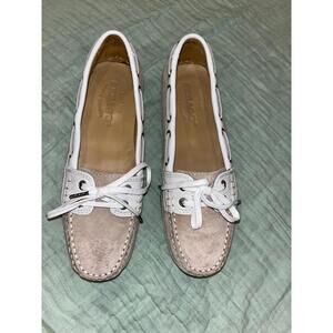 Step out in style with these classic Sebago women's loafers. Featuring a chic combination of beige suede and white leather accents, they offer both comfort and timeless fashion.