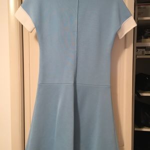 This cute mod baby blue dress has some Alice in Wonderland vibes to it. The polyester fabric is a little thick, with cute cuffed short sleeves, a zipper up the back, and button details. There is a pen park on the inside of the collar (which can’t be seen while it’s worn), and a small pull in the front shown in one of the pictures. It fits like a Medium/Large, and pairs well with white flats.