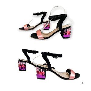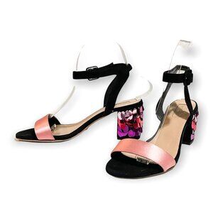Sebastian Milano Suede and Satin Ankle strap Sandal with Pailette Heel, 37 EU