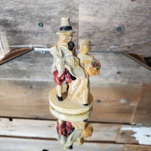 Originally designed on speculation for the Toll House restaurant in Whitman, Massachusetts, the Pilgrims were sold at retail through Schmid Bros from the beginnig. The base was changed to a more ornate base in 1958, and the name was changed to "Thanksgiving Couple". This piece is the original design of 1947 before the changes. Original Marblehead label still on the bottom. 41 years ago, this piece was valued at $50.