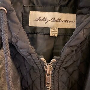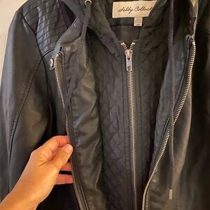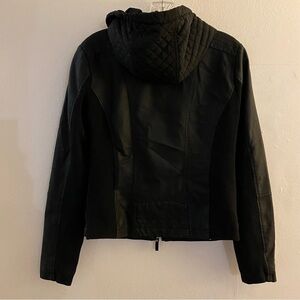 Sebby Collection black pleather and knit moto jacket, warm with hood, excellent condition, size small.