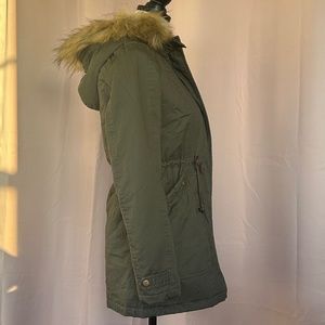 Sebby winter softshell coat, army green color, creamy white interior, open pockets, removable faux fur, used.