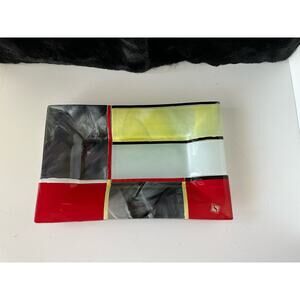 Sebino Arte fused glass is handcrafted by Master glass workers in Italy. They like to use their colors, light & shadows to harmonize in their glass. This beautiful glass tray/plate uses the colors of red, yellow, black, gray and white. In excellent condition and measures 13" x 8.5" wide. Has a shallow flare around the raised glass center. NO chips or cracks. Has original sticker still attached.