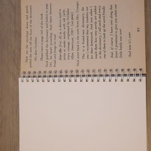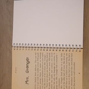 This is a journal made from the old paperback book Frindle by Andrew Clements. The 1st and last few pages of the book are left in, and approximately 50 blank pages are added to fill your journaling, notebook, or sketchbook needs