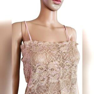This lace camisole is in excellent condition, no tears or stains. It's a soft, taupe color with contrasting pink. It's definitely see through, so this is a great layering piece, unless you're planning to free the nipple!