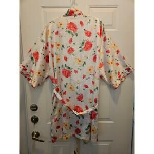 Secret Treasures Kimono Wrap Robe Satin Polyester Cream background, Large Roses yellow flowers and leaves. Short style. 3/4 length sleeves. Sash type ties with loops at waist. 35" long.